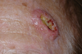 Fig.5: Carcinoma espinocelular: Por su evolución clínica en pocas semanas se puede tratar tambien de un queratoacantoma. En la histopatología es difícil diferenciar los dos tumores.
