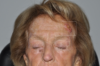 Fig.6.:Paciente con múltiples tumores malignos y premalignos: Queratosis actínica, Epitelioma basocelular nodular, |