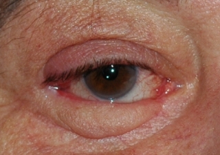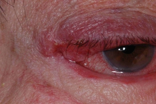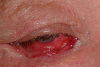 Fig. 2: Después de la resección y la reconstrucción del párpado inferior entero se formaba una recidiva en el canto lateral en un mes. |