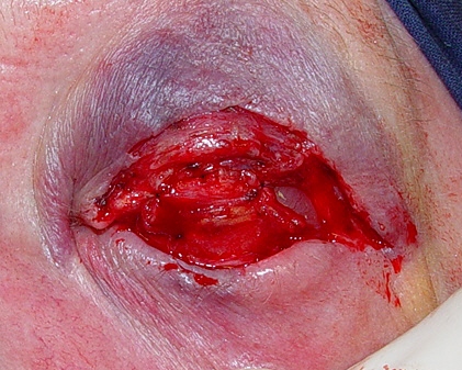 Fig. 4: Se unen los colgajos de los retractores del párpado inferior y del párpado superior en el nivel del fornix superio. La piel se transplanta como injerto libre. |