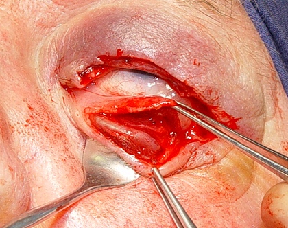 Fig. 3: De la lamela posterior del párpado inferior se forma un colgajo de retractores y conjuntiva, que se puede elevar al fornix superior. |
